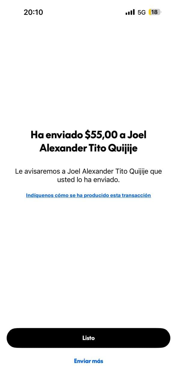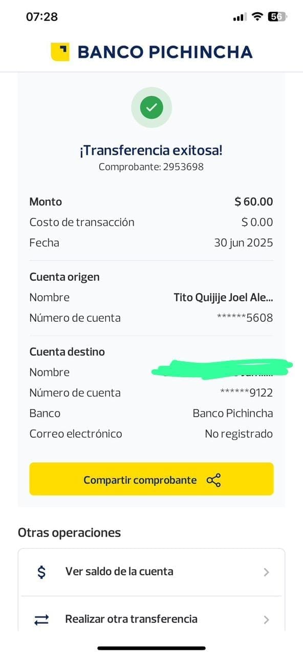 Cliente de Ecuador: 60 USD (transferencia)